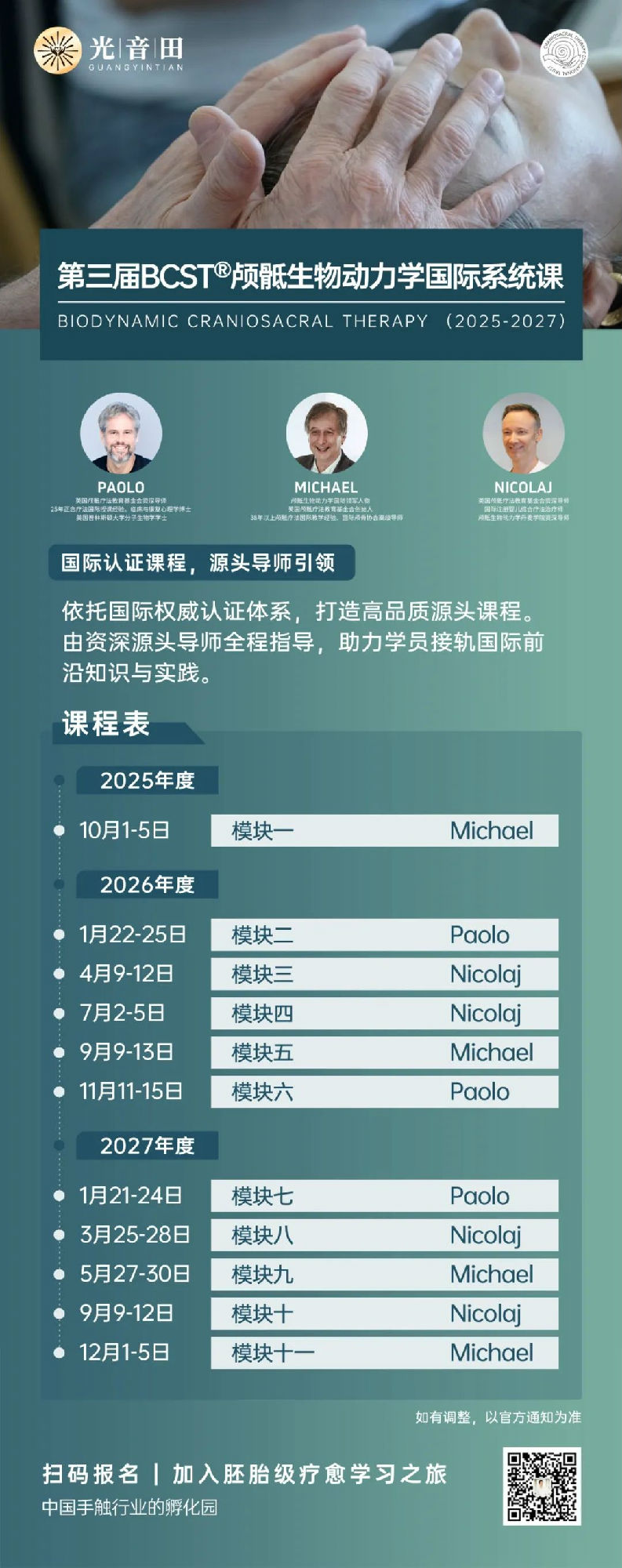 生物动力学从业者通过触诊和感知我们人类形态和生命过程的形成力量——最初的胚胎形成,到维持形态和协调整个生命的疗愈过程。